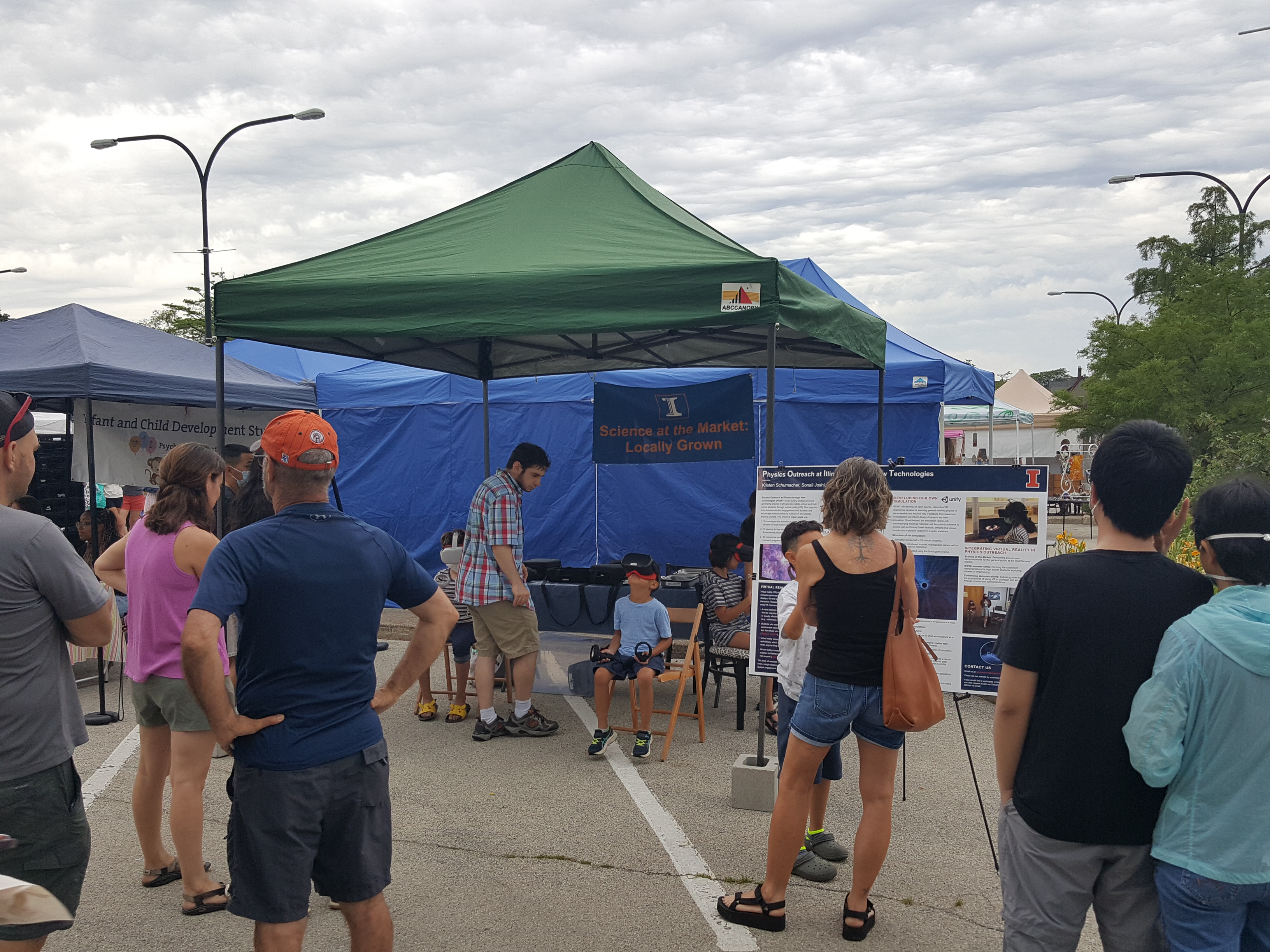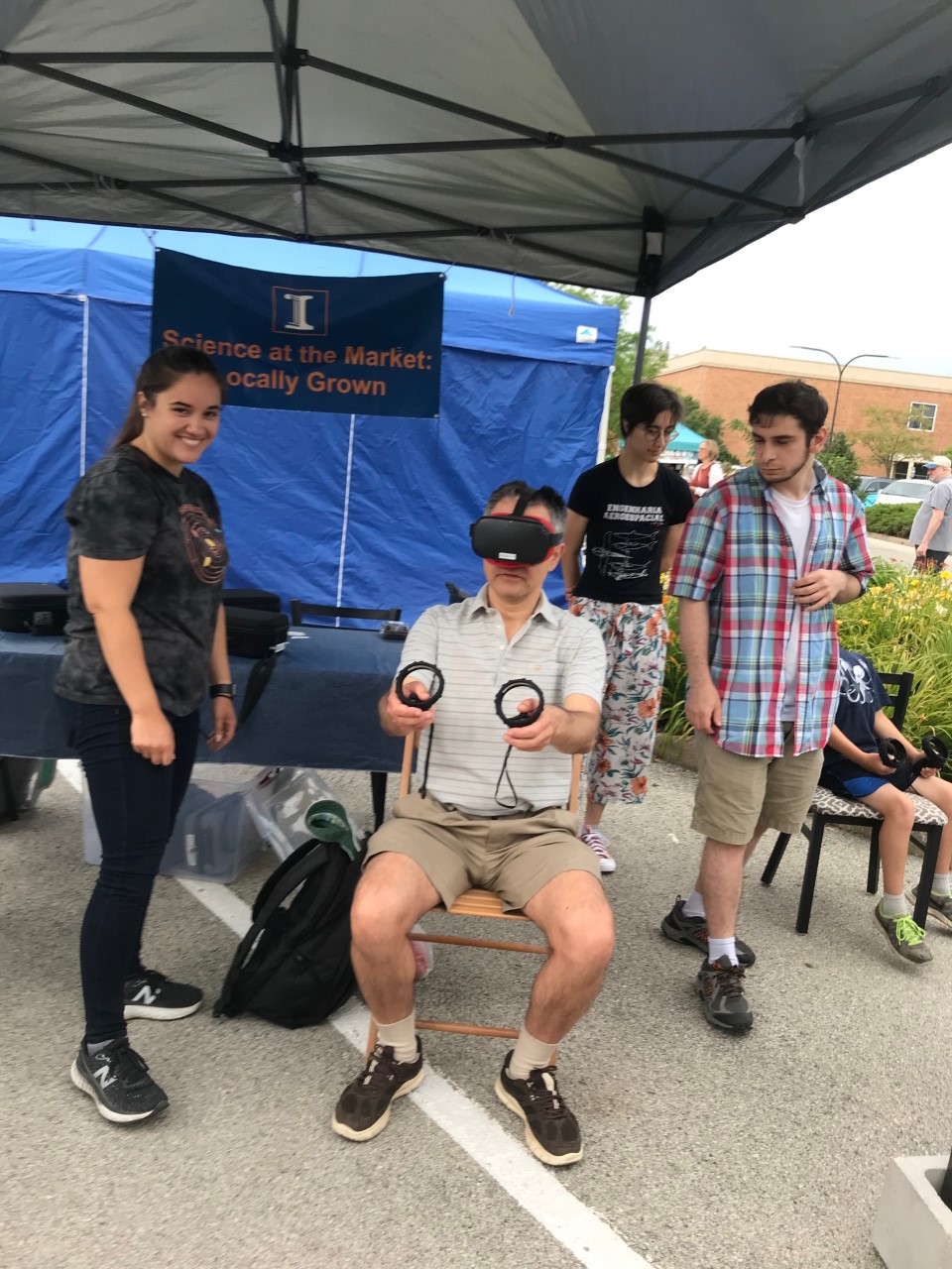 Illinois Physics graduate students Brandon Buncher, Amanda Gatto Lamas, and Kristen Schumacher represented Science at the Market on June 25, 2022 as part of Point VR, a project developed by Kristen Schumacher that allows participants to experience a simulation of falling into a black hole and interacting with gravitational waves generated from black hole collisions. Kristen is a PhD student in Nico Yunes' group, Amanda is a PhD student in Eric Chitambar's group, and Brandon is a PhD student in Gil Holder's group.