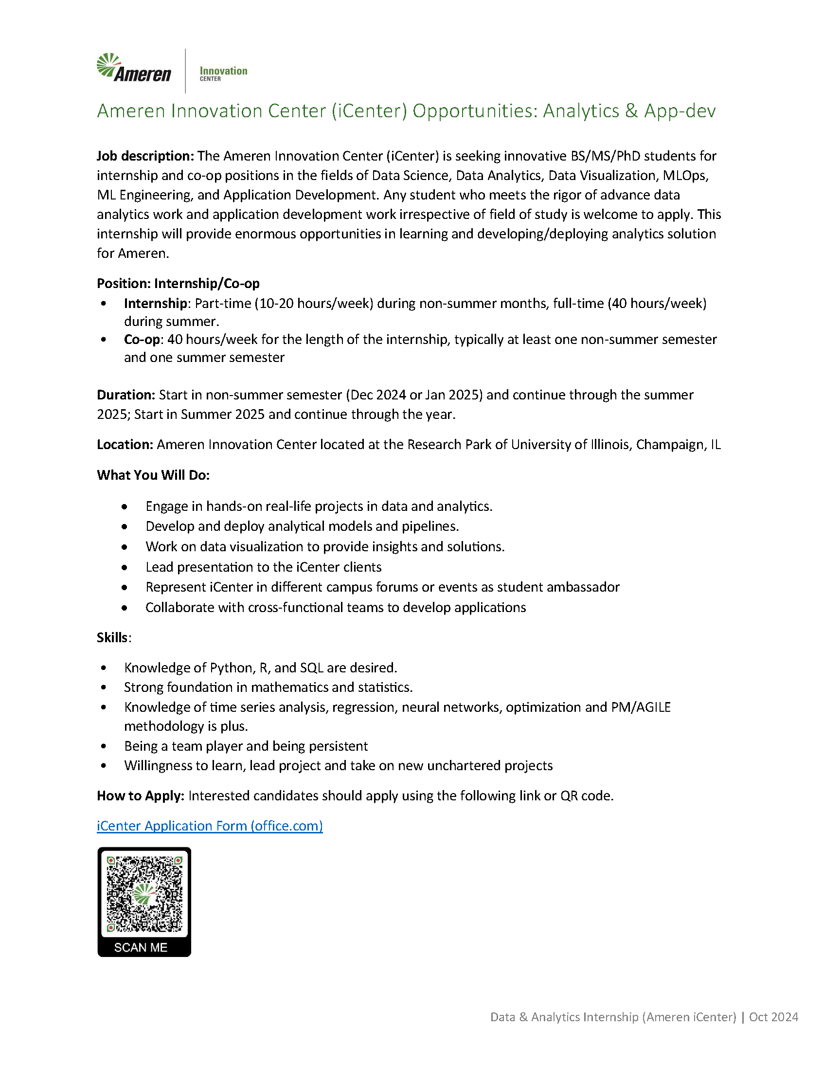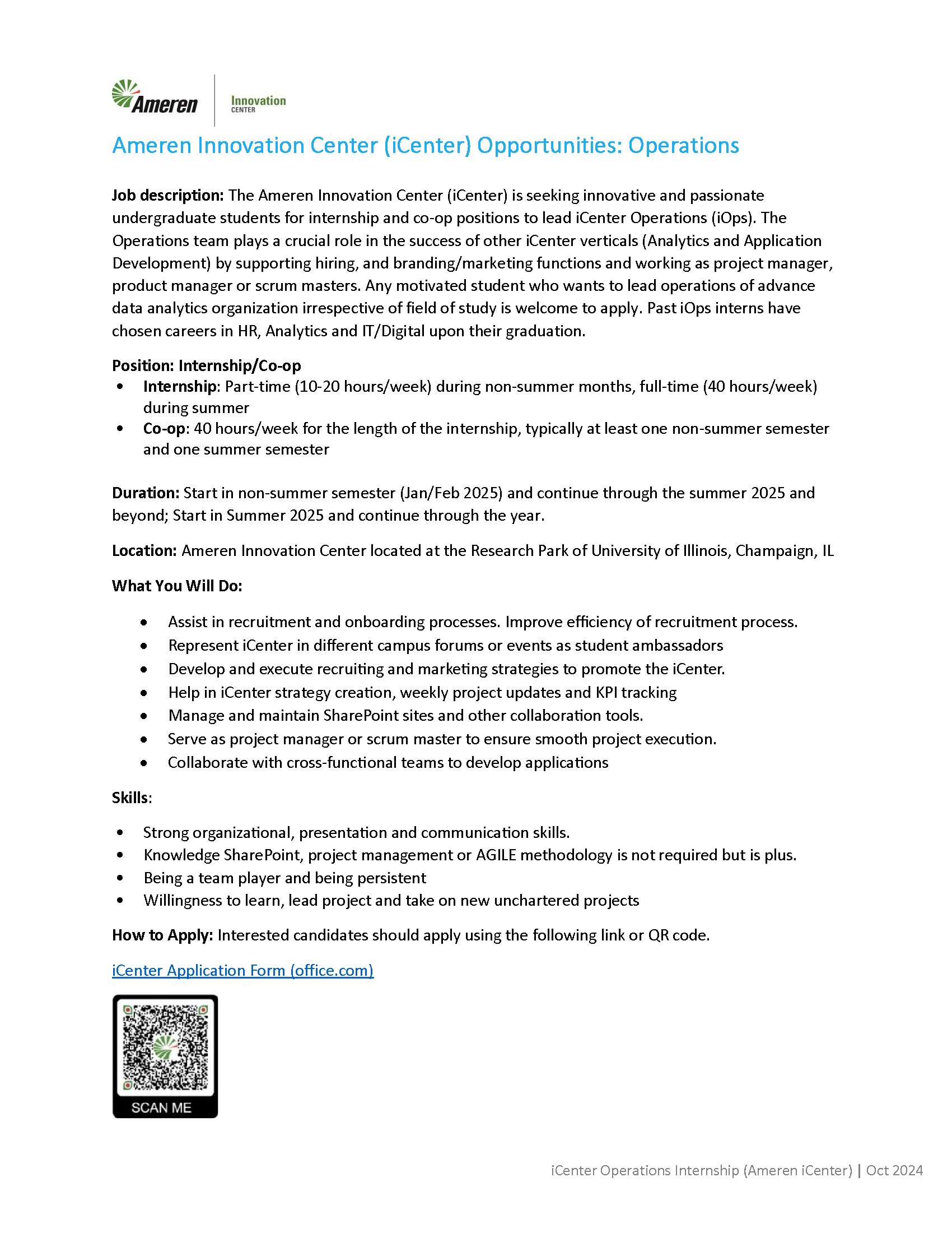 Job description: The Ameren Innovation Center (iCenter) is seeking innovative and passionate undergraduate students for internship and co-op positions to lead iCenter Operations (iOps). The Operations team plays a crucial role in the success of other iCenter verticals (Analytics and Application Development) by supporting hiring, and branding/marketing functions and working as project manager, product manager or scrum masters. Any motivated student who wants to lead operations of advance data analytics organization irrespective of field of study is welcome to apply. Past iOps interns have chosen careers in HR, Analytics and IT/Digital upon their graduation.
