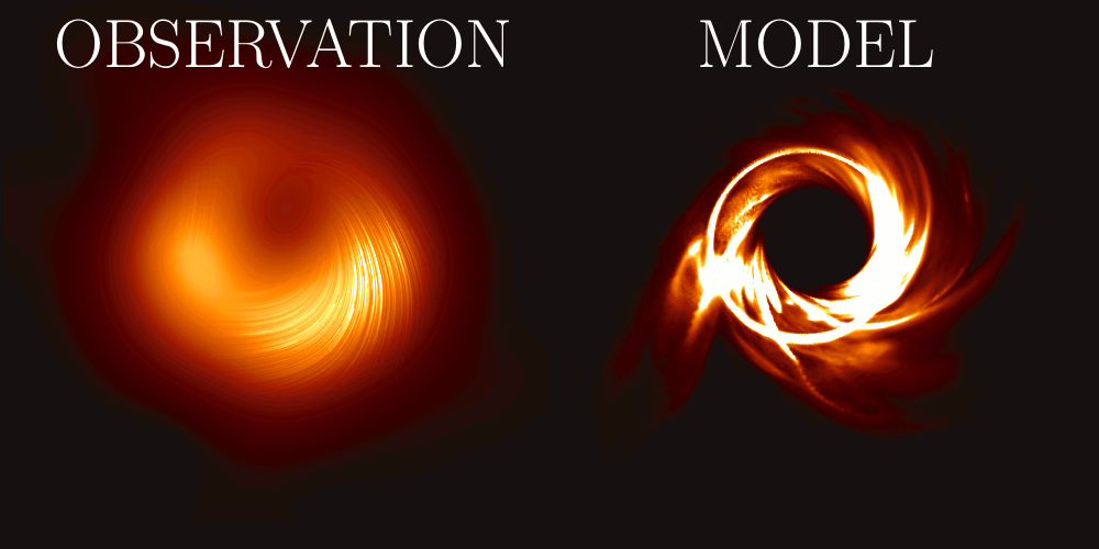 Comparison (2021) between Event Horizon Telescope observations of the black hole at the center of M87 (in intensity and polarization) with the best-fit model simulations.