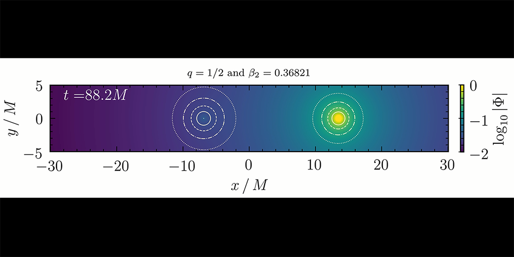 Numerical simulation (2020) of a head-on collision of two black holes in a modified gravity theory, in which black holes have additional attributes ("hair") not present in general relativity. Understanding those phenomena is important to perform strong-field tests of gravity, e.g., with gravitational waves.
