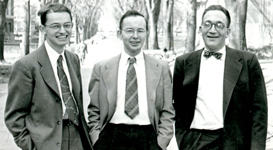 Brand new faculty member Charlie Slichter, graduate student John Blair, and Sid Drell on the Quad on their way back from a UI football game in 1951
