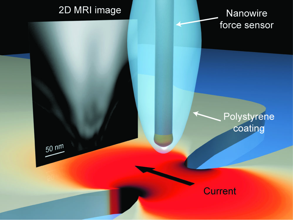 This illustration of the experimental setup shows the two unique components of the team's novel MRI technique that was successful in producing a 2D MRI image with spatial resolution on the nanoscale. Image courtesy of Raffi BudakianIn their proof-of-principal demonstration, the team used an ultrasensitive magnetic resonance sensor based on a silicon nanowire oscillator to reconstruct a two-dimensional projection image of the proton density in a polystyrene sample at nanoscale spatial resolution.
