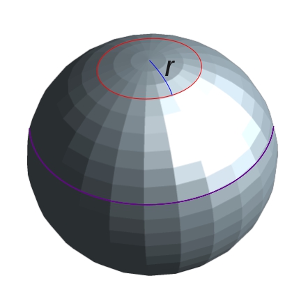 A lot of people are celebrating Pi Day on March 14, 2015 at 9:26 am. (This makes sense, of course, only if you put the month before the day when you write your date.) But let us not forget that π (the ratio of a circle's circumference to its diameter) is not actually constant in non-Euclidean geometry. And since we live on a two-dimensional spherical surface, this might actually make a difference for circles much smaller than we would intuitively might have guessed. But first, let's do some simple geometry: Imagine a sphere of radius R. We define a circle on the surface of that sphere as we would define a circle anywhere: a geometrical shape consisting of points equally distant from a selected point. On a 2D spherical surface those circles look like this:
