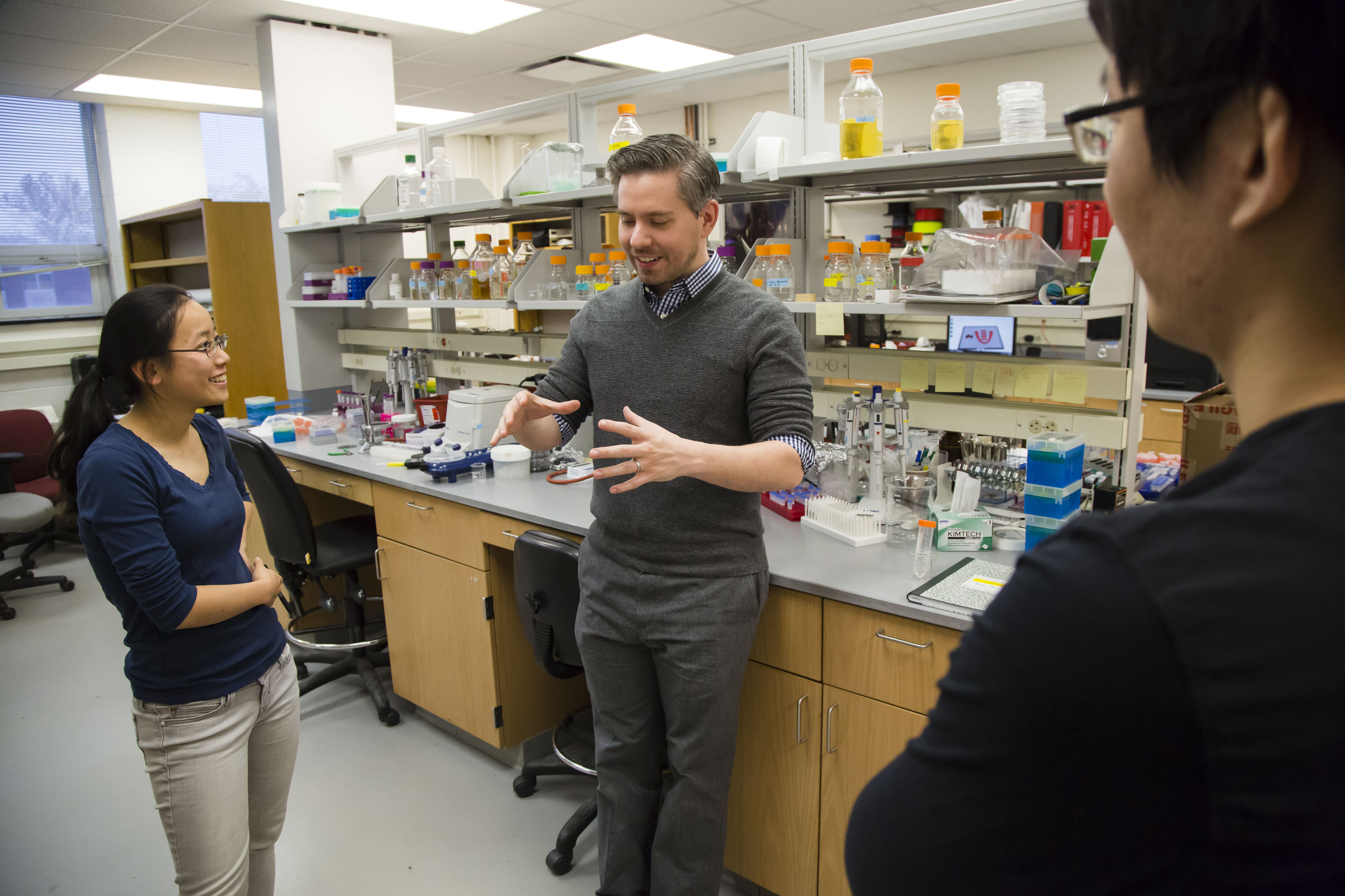 University of Illinois Assistant Professor of Physics Thomas E. Kuhlman discusses upcoming experiments with graduate students Gloria Lee and Hyuneil Kim in his laboratory at the Center for the Physics of Living Cells. Photo by L. Brian Stauffer, University of Illinois at Urbana-Champaign“These are genes that hop around and change location within the genome of a cell,” said Kuhlman. “We hooked that activity up to a molecular system, such that when they start hopping around, the whole cell fluoresces. In our experiment, cells fluoresced most when they weren’t very happy. One school of thought suggests that an increased mutation rate like this might be an advantage in such unhappy conditions, for cells to diversify.”