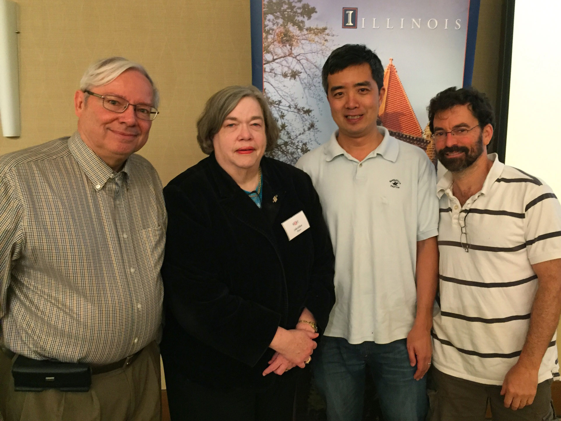 Celia Elliott poses with Professors Dale Van Harlingen (left), Liang Yang, and Paul Selvin (right) at the SPaRC Retreat at the I-Hotel in Urbana on Friday, September 16, 2016. Elliott was honored for her contributions to research administration at Physics Illinois.