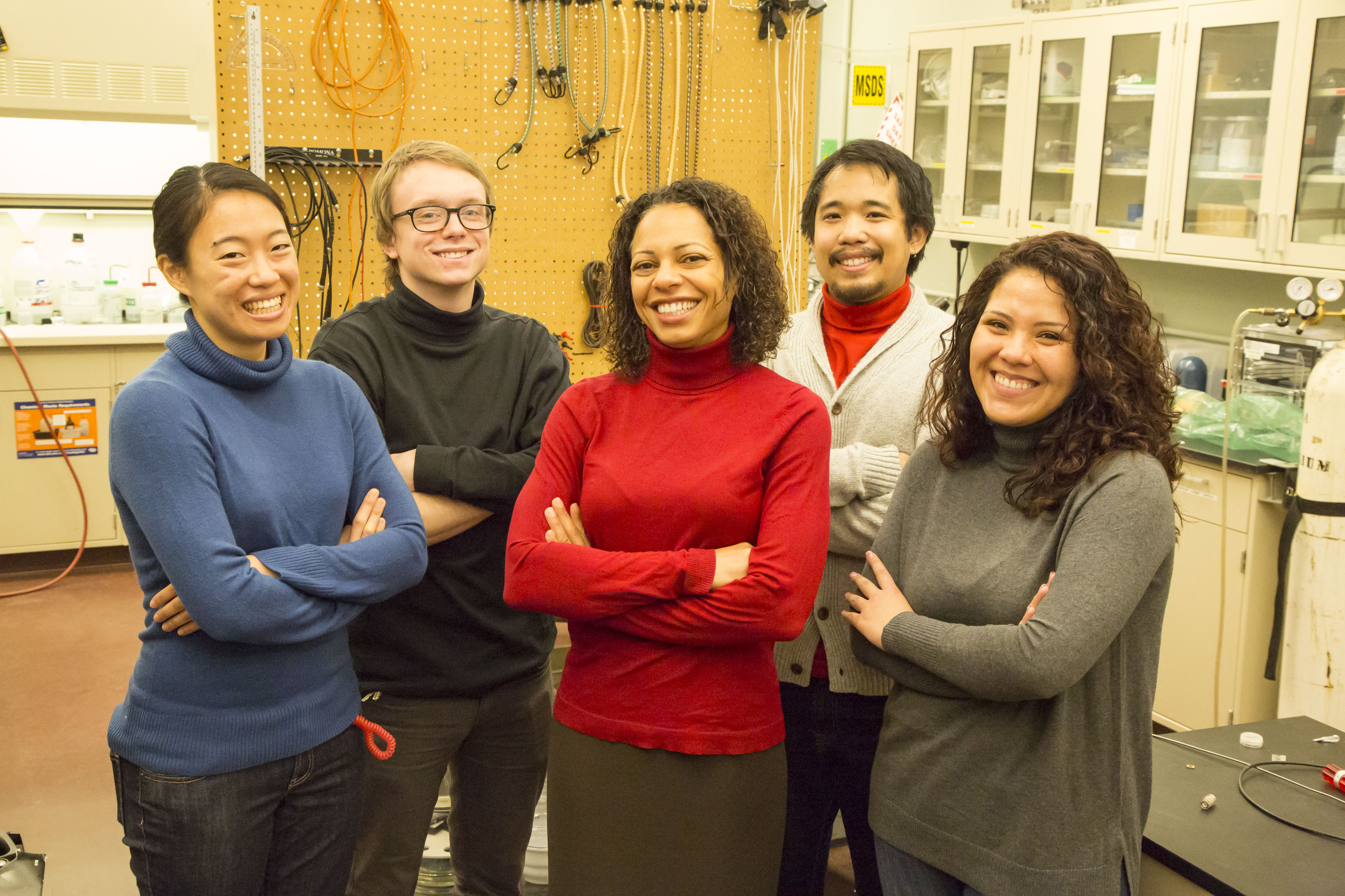 Nadya Mason poses with some of her graduate students in her laboratory in the Frederick Seitz Materials Research Lab. Photo by L. Brian Stauffer, University of Illinois at Urbana-Champaign