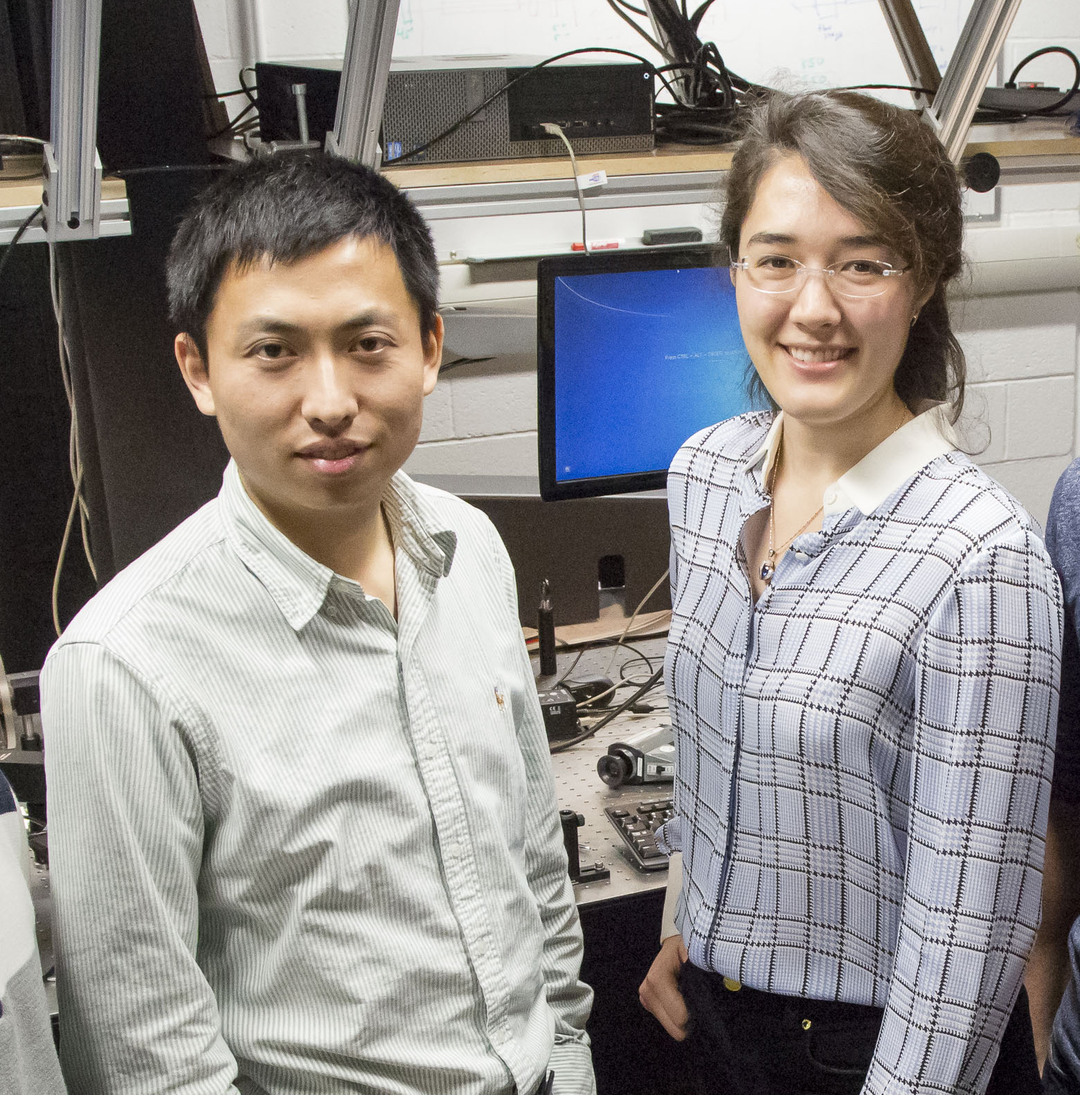 Researchers on this project are graduate student Bin Fang and principal investigator Virginia Lorenz, associate professor of physics. Photo by L. Brian Stauffer, University of Illinois at Urbana-ChampaignResearchers at the University of Illinois at Urbana-Champaign have constructed a quantum-mechanical state in which the colors of three photons are entangled with each other. The state is a special combination, called a W state, that retains some entanglement even if one of the three photons is lost, which makes it useful for quantum communication. Such entangled states also enable novel quantum applications and tests of fundamental physics.