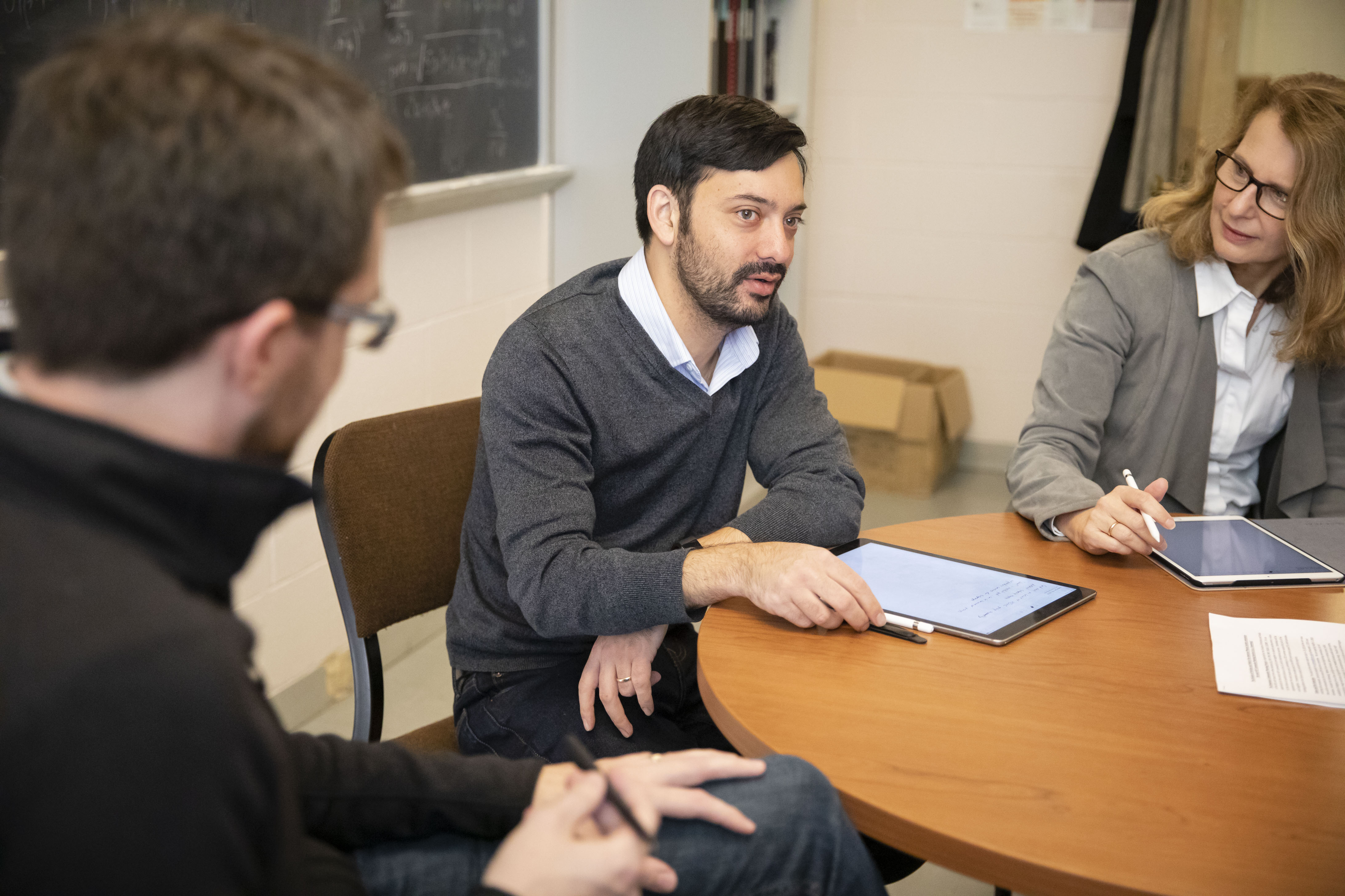 Professor Yonatan Kahn (center) talks with professors Patrick Draper (left) and Aida El-Khadra. Photo by L. Brian Stauffer, University of Illinois at Urbana-Champaign