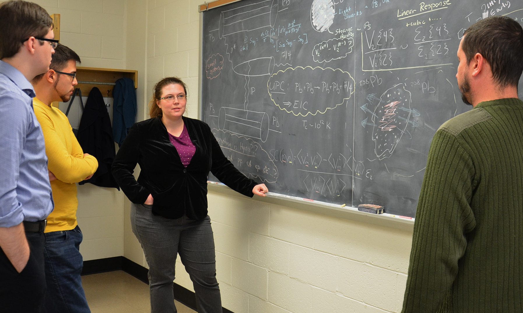 Professor Jaki Noronha-Hostler (center) works with postdoc Matthew Sievert (right) and graduate students Patrick Carzon (far left) and Travis Dore.