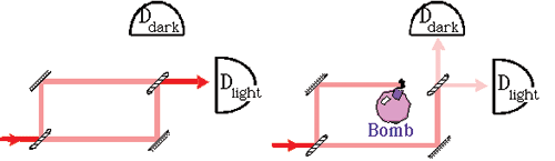What happens when there is an object—like the EV "superbomb"—in one of the paths? (See above, right.) Now we can use our classical notions to understand the possibilities. There is a 50% chance that a photon will take the path containing the object, resulting in an explosion. But if this didn't happen (also 50% likely), then the photon must have taken the other path. At the second beam splitter, there is no longer interference, since there is only one way to get there. Therefore, the photon again makes a random choice. There is thus a 25% (= 0.5 x 0.5) chance that the photon goes to D_light; such a result gives no information (but also does not disturb the bomb), since it would have happened in the absence of the bomb. There is also a 25% chance that the photon is detected at D_dark. This never happened in the absence of the bomb—whenever D_dark goes "click", we know that there was an object in the interferometer. And since we only send in a single photon, and it shows up at D_dark, it could not have interacted with the object in the interferometer (which object, even if it does not actually explode, is assumed to be completely non-transmitting).