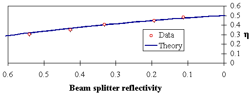 Now, it turns out that by adjusting the reflectivities of the beam splitters in the interferometer, it is possible to achieve P(D_dark) = P(boom) (well, almost—see the theoretical plot of the efficiency below, as well as our experimental data). For this case, the efficiency is 1/2. (Note however, that in this limit, both P(D_dark) and P(boom) actually approach 0, while P(D_light) --> 1.) The question immediately arose, is 50% the best we can do—are we destined to be blown up half the time?