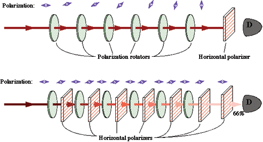 However, if we intersperse a series of horizontal polarizers, one at each stage, then the outcome is quite different. For concreteness, consider the case of six cycles, so that the rotation angle at each stage is 15°. At the first polarizer, the photon has only a small chance of being absorbed --> 6.7% = sin2(15°). If it is not absorbed, then by the projection postulate, the photon must be horizontally polarized. The identical process happens at every stage. For the case of N=6, the chance that the photon was transmitted through all 6 polarizers is simply (cos2(15°))6, which is about 2/3. Note that without the interspersed polarizers, we never saw light at the detector. Hence, whenever we get a "click" at the detector, we know that the extra polarizers were inserted. Moreover, if we perform the experiment with a single photon input, and it shows up at the final detector, then of course it could not have been absorbed by any of the extra polarizers. And as we let the number of stages N become large (at the same time reducing the angle of polarization rotation accordingly), then the probability that the photon is absorbed vanishes—the photon is always transmitted!
