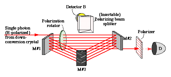 What we found, in agreement with the above predictions, is that when the polarizing beam splitter (which transmits horizontal polarized light, and reflects vertical polarized light) was not in place, the detector D essentially never fired; whereas when the polarizing beam splitter was in place, the detector D fired 2/3's of the time.
