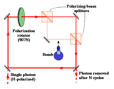 Consider the system shown at the right: We again have a cycled photon, as in the previous demonstration of the Zeno effect. It makes N cycles in the system before being let out, and its polarization analyzed. At each cycle, again there is a rotation of the polarization by 90°/N, so that at the end, the initially horizontally-polarized photon is vertically polarized. The key difference to the previous experiment is the inclusion of the polarization Mach-Zehnder interferometer. Instead of normal beam splitters, it uses two polarizing beam splitters, which transmit horizontal and reflect vertical polarized light. The two arms of the interferometer are set up to have equal lengths. Therefore, any incident light is split into the horizontal and vertical components (the former taking the "high road", the latter taking the "low road"), which are then added up again to reform the original polarization state.
