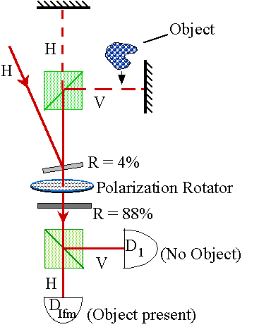 The current setup used at LANL to demonstrate interaction-free measurements is shown to the right. A very weak pulse (less than 1 photon) is produced from a 670nm laser diode. The pulse is coupled by a 4% reflector into our system, with an initial Horizontal polarization. The pulse is cycled in the system by the 88%-reflecting mirror, its polarization rotated each cycle by a small amount (determined by the orientation of the rotator [a quarter waveplate]).