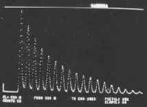 A time-resolved image of photons escaping the interferometer. Vertical axis shows the number of photons and horizontal axis shows time (relative to when the pulse was first sent into the system). The entire horizontal axis shows a duration of about 50 ns.