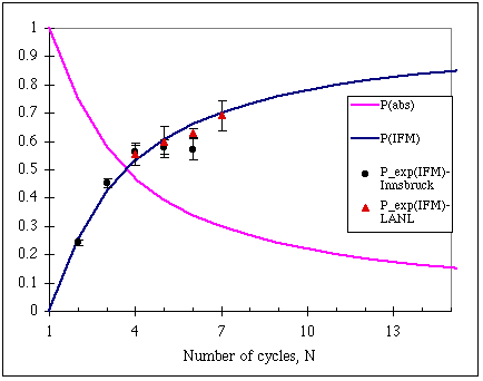 Theoretical curves of the probability of making an interaction-free measurement, and the complementary probability of the object absorbing the photon. Last year's data from Innsbruck is shown, as is the most recent LANL data, demonstrating interaction-free measurements nearly 70% of the time.