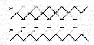 For simplicity, we have concentrated thus far on only a few simple systems. However, the techniques of interaction-free measurement can in fact be applied to any 2-level system. As another example, consider a series of connected, perfect Mach-Zehnder interferometers whose beamsplitters' reflectivities are R=cos2(pi/(2N)) where N is the number of beamsplitters (see figure below in (a)).