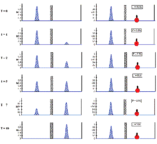 On the other hand, if there is an absorbing object in the right cavity, this will prevent the "sloshing" from occuring. At each cycle there will be a small probability that the photon will be absorbed by the object (simply given by the coupling transmittivity T = 1 - R). But if this doesn't happen, the wavefunction of the photon is "collapsed" back into the initial cavity and we start all over again. Thus, at the end of the N cycles, the photon has a probability RN of still being in the left cavity (and a probability 1 - RN that it was absorbed by the object). As we let the number of cycles N go to infinity (easier said on a Webpage than done in reality), the photon always stays in the initial cavity.