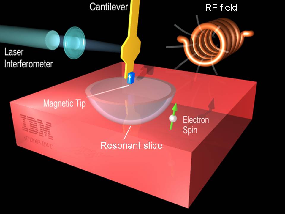 MRFM is a powerful new technique that combines the high sensitivity and spatial resolution of scanning probe microscopy with the three-dimensional imaging capabilities of magnetic resonance imaging. In MRFM detection, a micron-sized permanent magnet is attached to the end of a sensitive silicon cantilever and brought near a sample containing electron or nuclear spins. In the presence of the inhomogeneous field from the tip, the Larmor frequency of the spins is a strong function of position with respect to the tip. A microwave field applied to the sample resonantly excites only those spins that lie within a thin slice near the probe tip. The spins located within the �resonant slice� experience a force caused by the strong field gradient. This force can be detected by measuring either the cantilever amplitude or frequency.