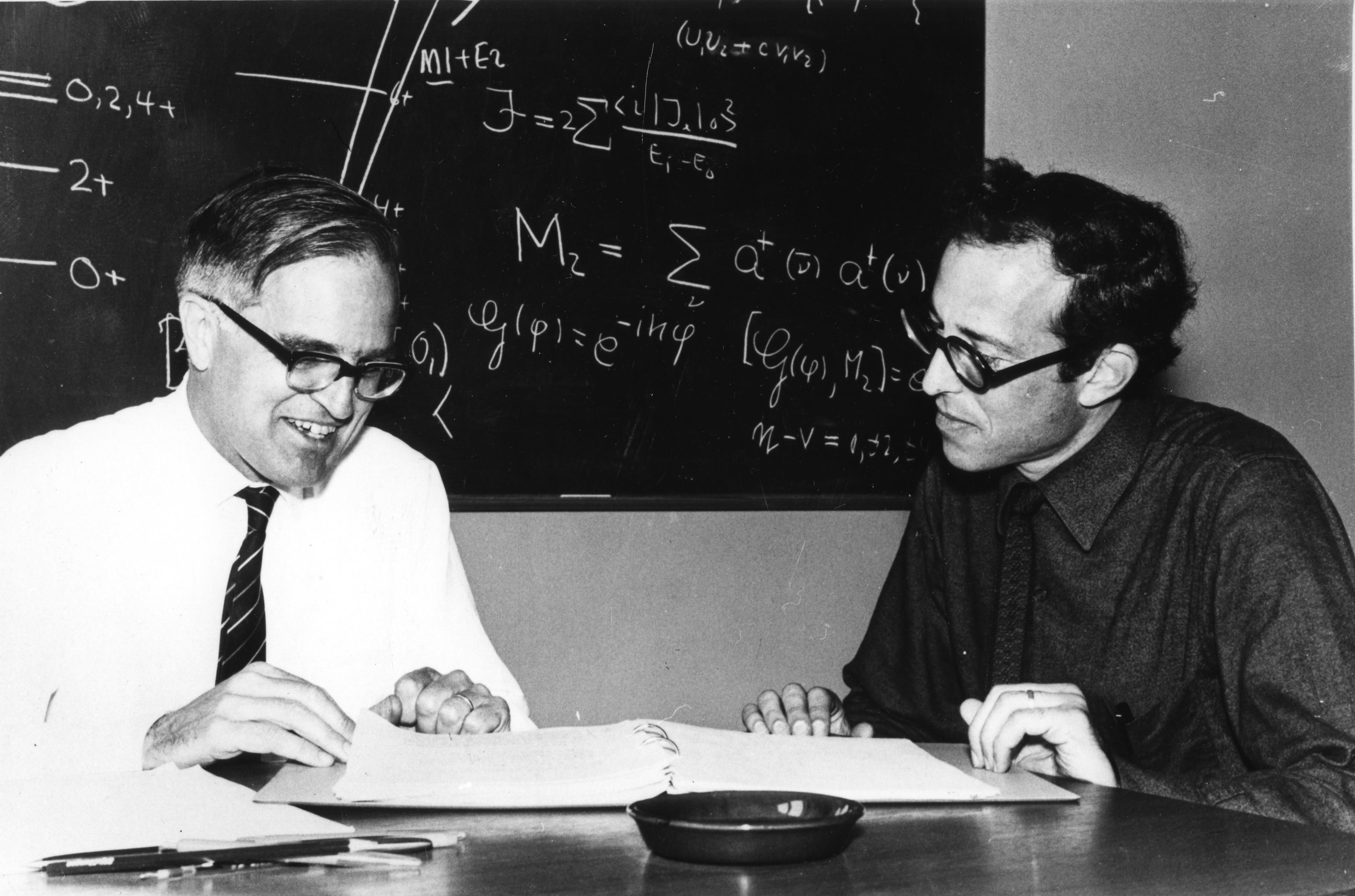 1957At the Bohr Institute, David Pines collaborates with Aage Niels Bohr and Ben Roy Mottelson, introducing them to the theory of superconductivity by showing the relevance of these concepts to pairing in nuclear physics. The paper by Bohr, Mottelson, and Pines on a possible analogy between the excitation spectra of nuclei and those of the superconducting metallic state represents the first-ever application of BCS concepts to nuclear physics.