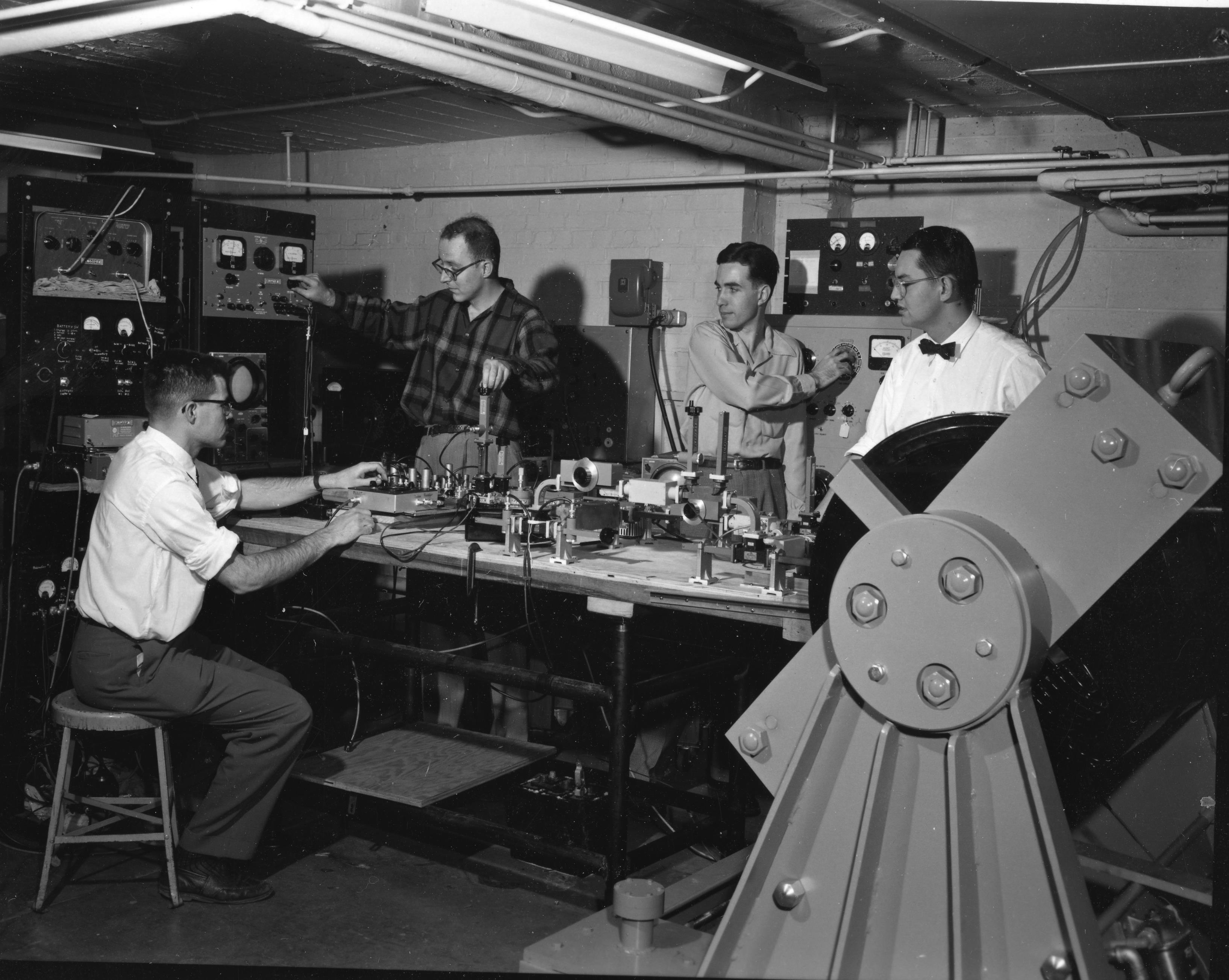 Inspired by David Pines, Charles P. Slichter and graduate students Thomas R. Carver and Robert Schumacher measure electron spin contribution to the magnetic susceptibility of metals for the first time. The experiment opens an important door to understanding interactions of electrons in metals, a problem at the theoretical forefront at the time.