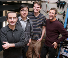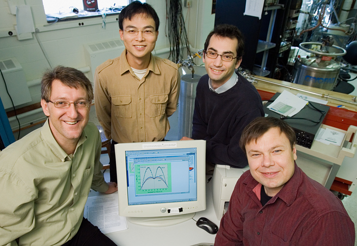 2010University of Illinois physicists, led by experimentalist Raffi Budakian and theorist Paul Goldbart, report the first observation of half quantum vortices (HQVs) in strontium ruthenium oxide (SRO), an unconventional superconductor. Using state-of-the-art nanofabrication methods and exquisitely sensitive cantilever-based magnetometry techniques developed by the group, the researchers observe minute fluctuations in the magnetism of tiny rings of SRO. HQVs are an exotic state of matter predicted theoretically for more than 30 years but never before directly observed. These HQVs in SRO may provide the basis for topological quantum computing.