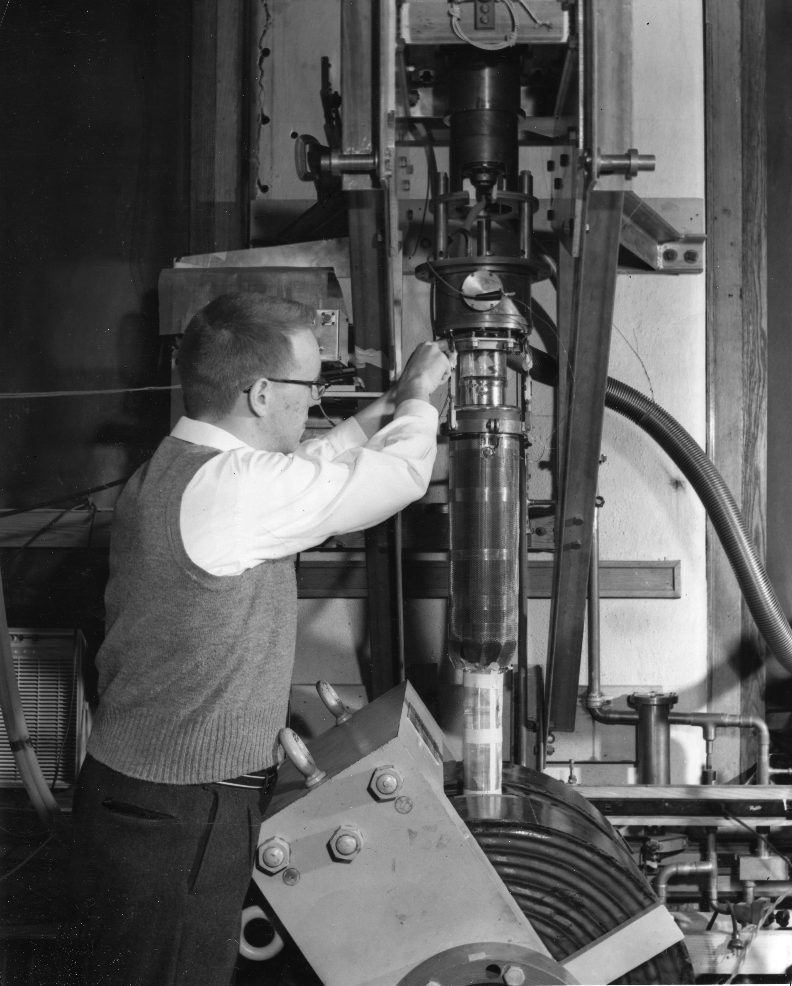 1955Dillon E. Mapother builds a specially designed cryostat that allows precise ballistic induction measurements under conditions of exceptionally good temperature stability, down to temperatures of about 0.8 K. He and his students use the instrument to make precise measurements of the superconducting transition of aluminum, published in Physical Review in 1958.
