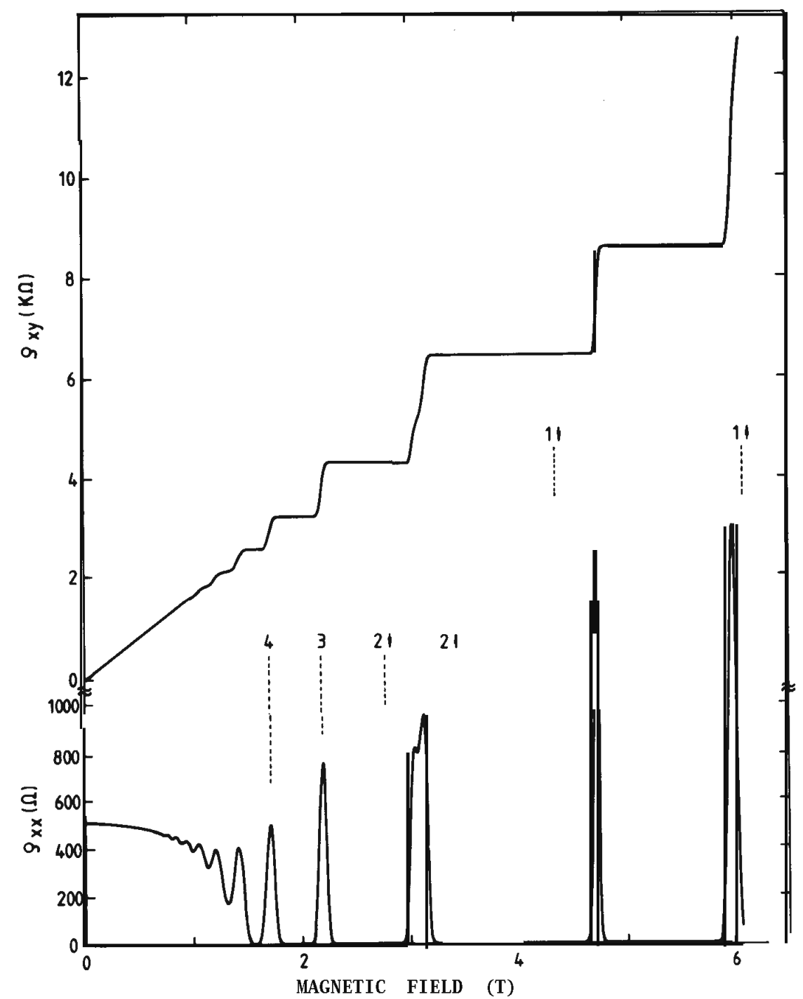 Despite the counterintuitive phenomena quantum Hall systems exhibit, they are surprisingly straightforward to set up. All one needs is a strong magnetic field oriented perpendicular to a flat conductor. Measure the transverse (Hall) resistance and one finds a staircase of perfectly flat plateaus whose heights are exact integer multiples of fundamental constants (see figure 1). This is a remarkable result as it violates the notion that classical formulations of physics should be accurate on macroscopic scales aside from small quantum corrections. This is known as the correspondence principle. We now know that the correspondence principle does not apply to the QHE because of collective effects. Crucial to the QHE is the fact that a macroscopic number of electrons — one hundred billion for a fingernail-sized conductor in a magnetic field of 1T — all have the same energy. In other words, instead of quantum effects averaging out over many particles, they are enhanced by the combined effort of billions of electrons behaving cohesively. This property implies that the quantum Hall fluid (QHF) is a perfect candidate to feature unusual fluid mechanics since hydrodynamic quantities are also derived from averaging out the motion of many particles. Thus, the quantum effects of the QHF can easily infiltrate the hydrodynamic equations of motion.
