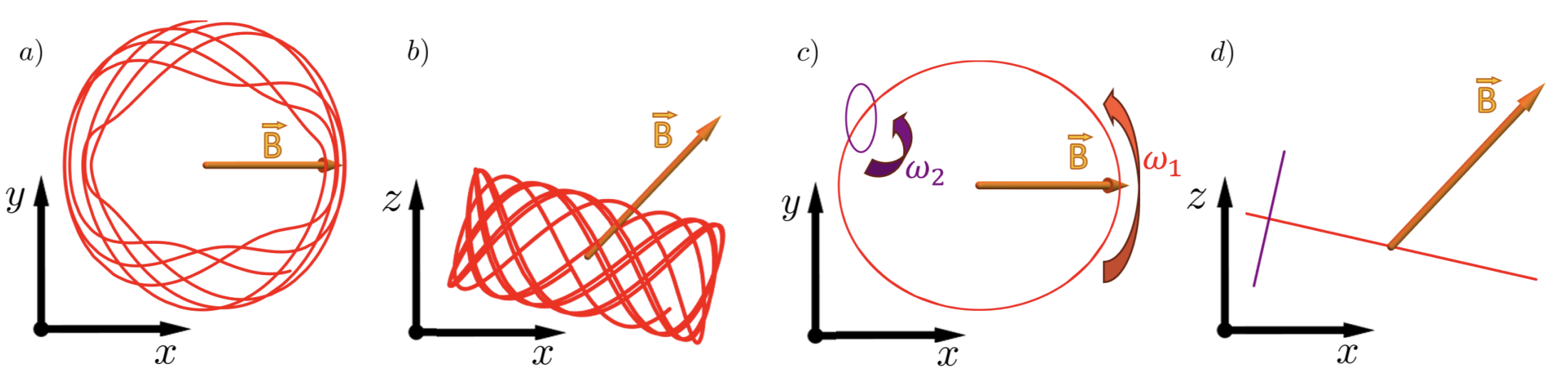 Figure 2 shows an example of a classical trajectory. Along with the magnetic field (orange vector), we must also take into account the force that confines the particles to a plane. Figures 2.a and 2.b show different perspectives of the seemingly chaotic path as the particle orbits the magnetic flux lines and is pushed toward the x − y plane by the confining force. These trajectories, however, are not chaotic; as shown in figure 2(c) and 2(d) the motion of the particle decouples into two ellipses. The total motion can be understood as the sum of the red and purple trajectories, i.e. the purple ellipse orbits the red ellipse with frequency ω1 while the particle orbits the purple ellipse with frequency ω2.