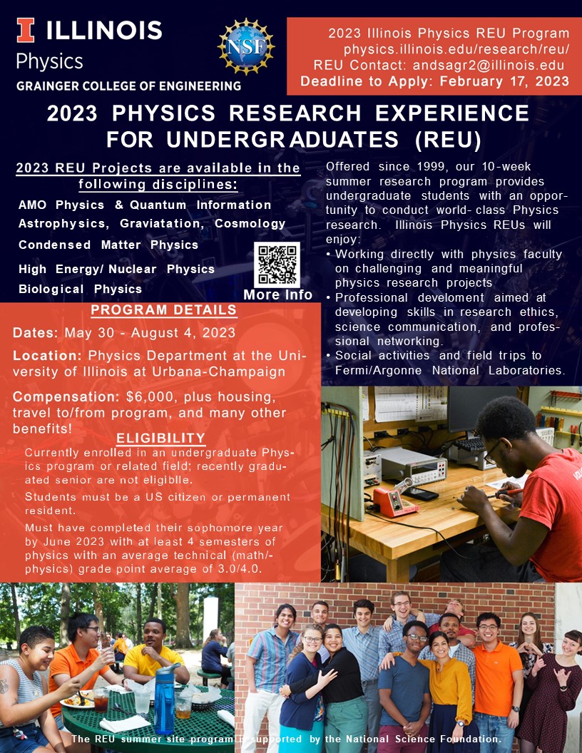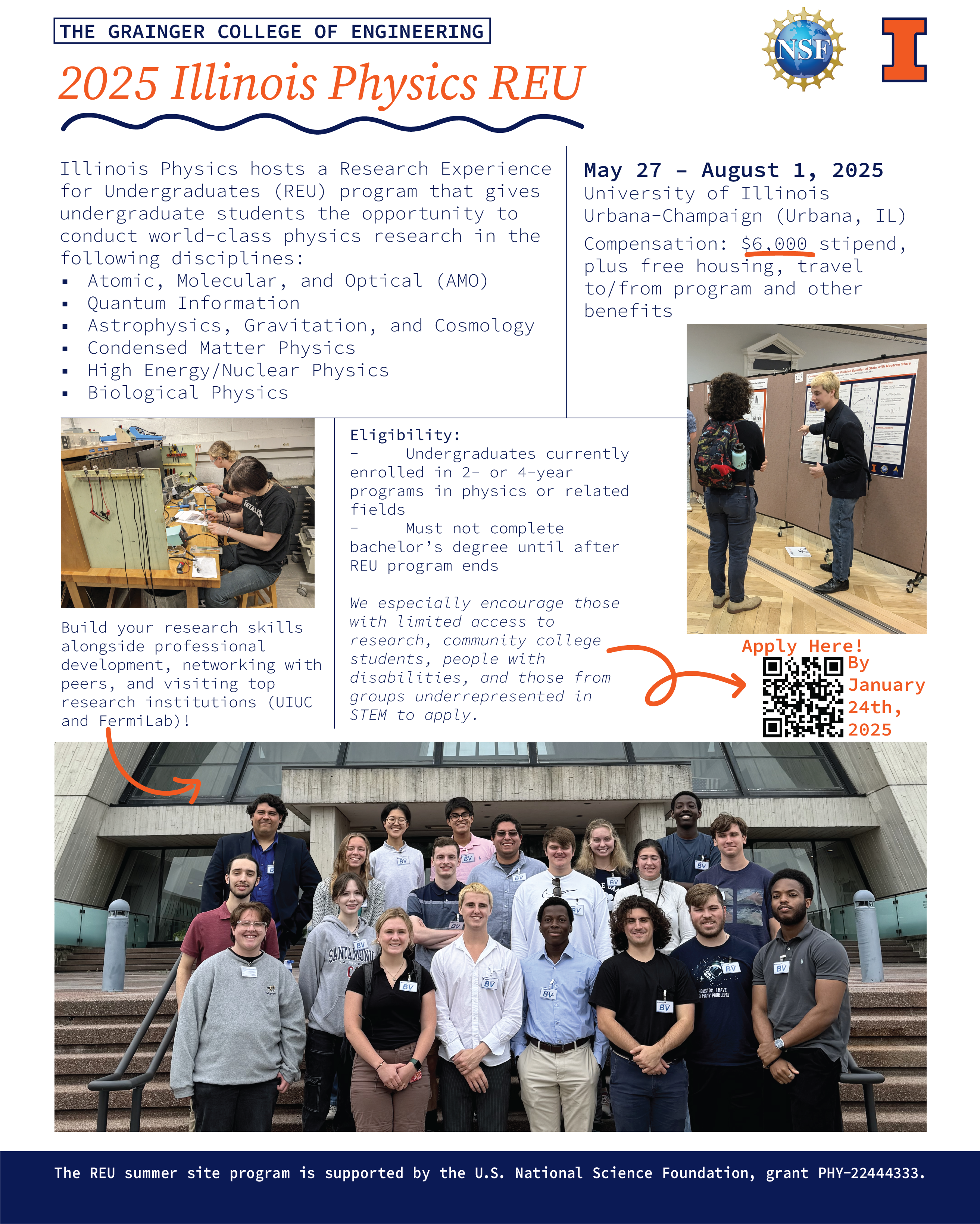 - December 4, 2026 — UIUC summer programs webinar 6-7:30pm (CT) go.illinois.edu/2026REUInfoSession